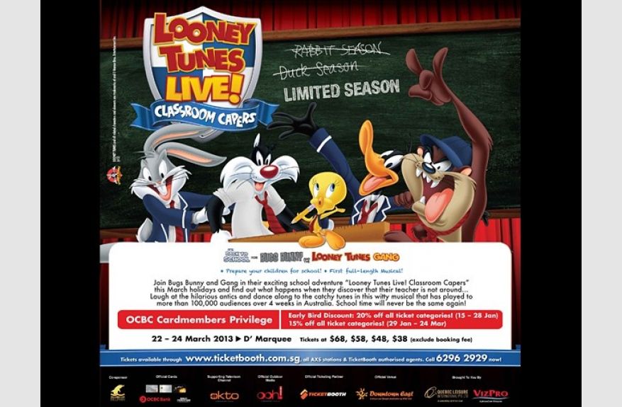 It’s back-to-school for Bugs Bunny and the Looney Tunes gang in Looney Tunes Live! Classroom Capers, starring Bugs Bunny, Daffy Duck, Tweety, Sylvester, Taz, Marvin the Martian and Porky Pig. Brought to you by Quebec Leisure International, a subsidiary of NTUC Club, and MediaCorp VizPro International, this exciting, fun- packed show will delight and entertain families at Downtown East from 21 to 24 March 2013.